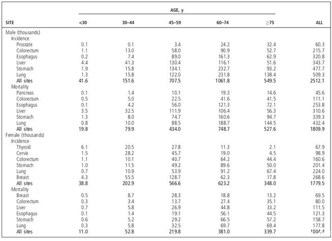 表 5 :5 2015 年中国不同年龄组特定癌症的新发病例和死亡人数(以千预测)