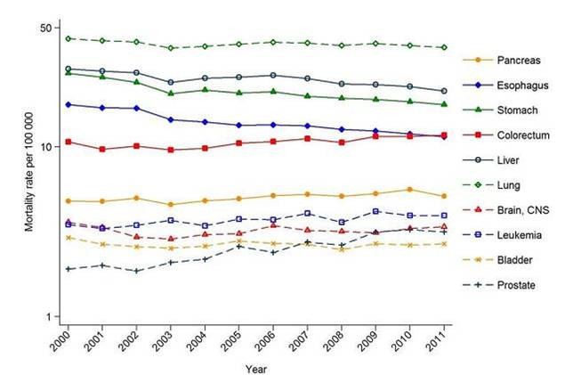 3,表 8)。尽管这是个好趋势, 但是由于老龄化和人口的增长, 实质上同期的癌症死亡人数仍然在上升(从2000 年 51,090 到 2011 年