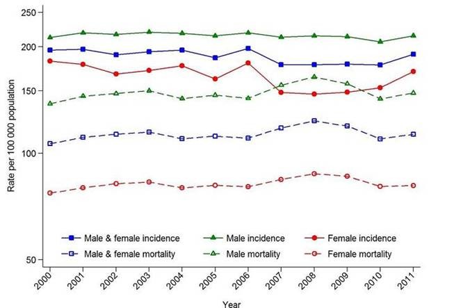 图 3 :2000-2011 年中国所有癌症 不同性别 的发病率和死亡率趋势(根据世界标准人口的年龄标准化)