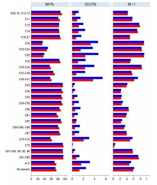 基于人群的癌症登记中心的数据质量的 3 个主要测量指标(MV%,DCO%,M/I),按癌症类型进行分类,表明所有数据质量对于两组癌症登记处均合理可靠(图