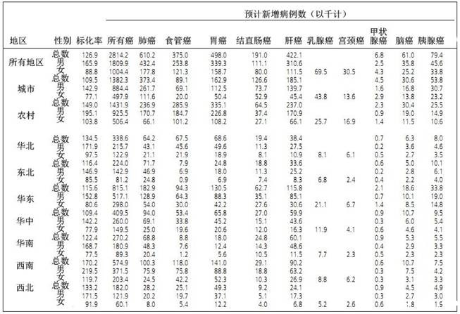 表 4:中国2015 年不同地区所有癌症的预计年龄标准化死亡率和特定癌症新增病例预测(以千计)