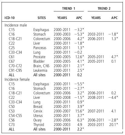 根据世界标准人口的标准,将 2000-2011 年间(22个登记中心)发病率和死亡率的动态变化趋势进行对数拟合,计算年龄标准化率(每 100,000人口)。为减少报告在此期间虚假变化趋势的可能性,所有的模型限制最多 2 个连接点(3 线段),趋势表示为年度百分比变化(APC),而 Z测试是用来评估 APC 统计是否不同于零。在描述变化趋势时,使用术语“上升”或“下降”评价趋势斜率(APC)具有统计学意义(P<0 .05)。无明显统计学意义的变化趋势用术语“稳定”评价。对于所有分析,我们报道的结果适用于所有癌症和 10 种按性别区分的最常见癌症。