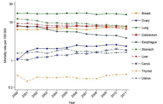 图 8 :2000-2011 年中国女性特定癌症的死亡率趋势(根据世界标准人口的年龄标准化)
