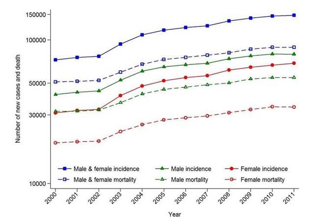 在 2000 和 2011 年间,中国确诊的癌症数量明显增加,大部分是因为人口老龄化和人口的增长。其他因素如不健康的行为或是与癌症发生与发展相关的生活方式的流行,疾病意识、检查服务和数据完善程度的提升都可能导致癌症负担的增加。女性前列腺癌、宫颈癌和甲状腺癌的发病率增长最大。导致前列腺癌增长的因素还未完全了解,