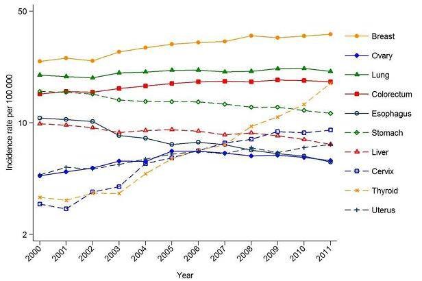 我国女性患甲状腺癌的人数急剧上升,这与其他国家的情况一致,同时越来越多使用新型成像技术(超声波、CT、核磁共振)可能反映出过度诊断”甲状腺,在缺乏有关疾病的信息的情况下,不可能排除真实发病率的增加。