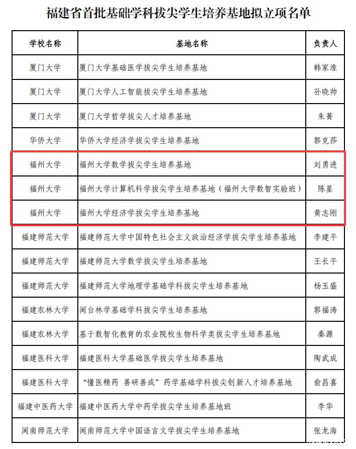 近日,福建省教育厅正式公布《首批基础学科拔尖学生培养基地立项名单》,全省8所高校共16个基地获批立项,我校数学拔尖学生培养基地、计算机科学拔尖学生培养基地、经济学拔尖学生培养基地成功入选。这是我校基础学科拔尖人才培养的阶段性成效,也标志着我校拔尖创新人才培养工作进入新发展阶段。