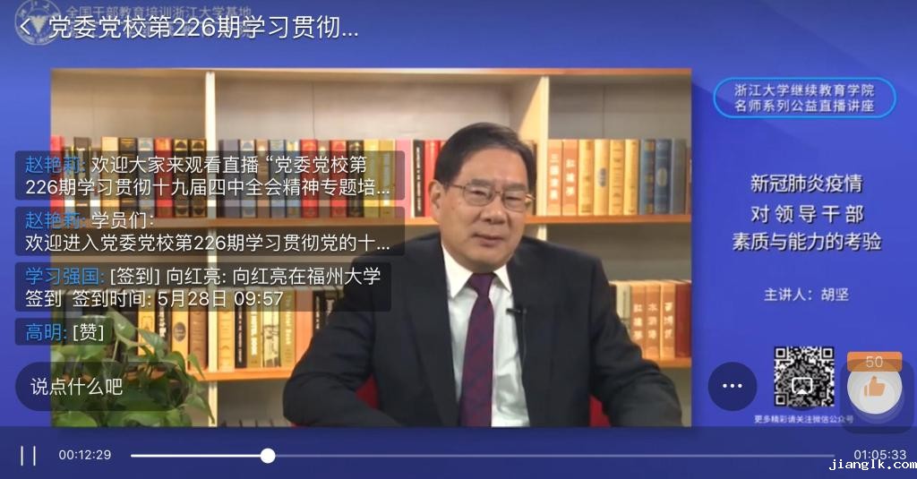 本讲主题为“新冠肺炎疫情对领导干部素质与能力的考验”的报告会为浙江大学继续教育学院名师系列公益讲座,由浙江大学求是讲座教授胡坚讲授。 疫情防控是一把尺子,测量出各级领导干部在关键时刻的能力与素质。胡坚教授从当下疫情防控切入,立足浙江工作实践经验,从提高政治素质和能力、重视智库作用、坚守人民情怀、树立使命感和责任感、敢于担当等方面解读了新冠肺炎疫情对领导干部素质与能力提升的五点启示。胡坚教授认为,浙江改革开放40多年的经验告诉我们,地域优势不如干部优势,政策优惠不如服务优质。领导干部要用心做事,要有强烈的事业心和责任感,不仅要承担职责,更要勇担使命。