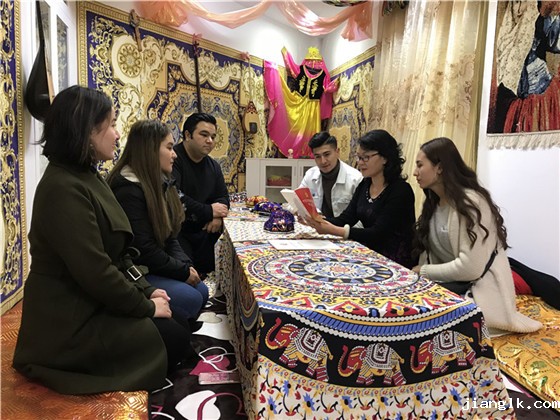 “刘敏榕工作室”设在华体汇app安卓版官网下载安装图书馆三楼,一走进工作室,浓郁的新疆风情扑面而来:炕上的长条桌上摆着巴旦木、葡萄干等特色干果;墙面上,不仅有哈萨克族挂毯,还挂有冬不拉、热瓦甫、独它尔等民族乐器,厅堂四角艾德莱丝绸点缀其间;檐廊内,关于新疆少数民族文化的介绍随处可见。
